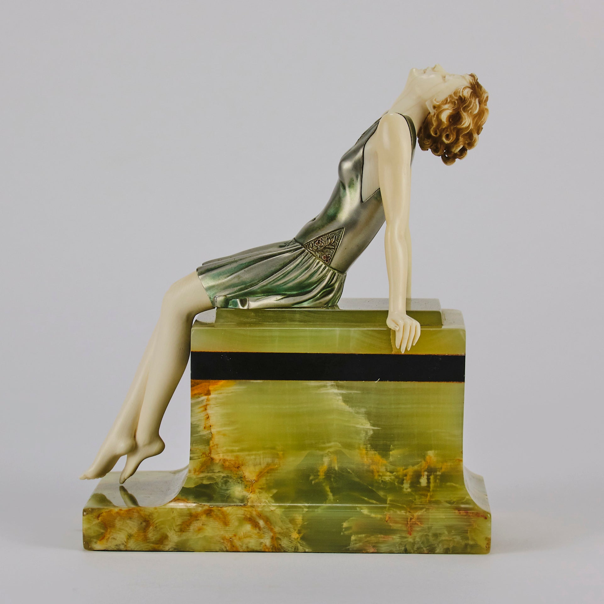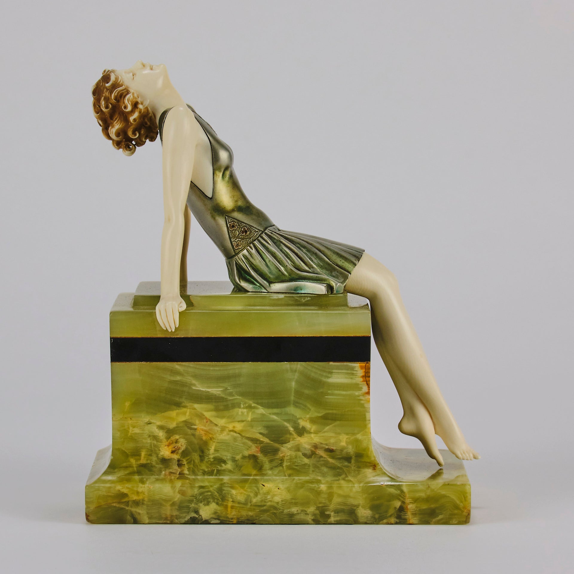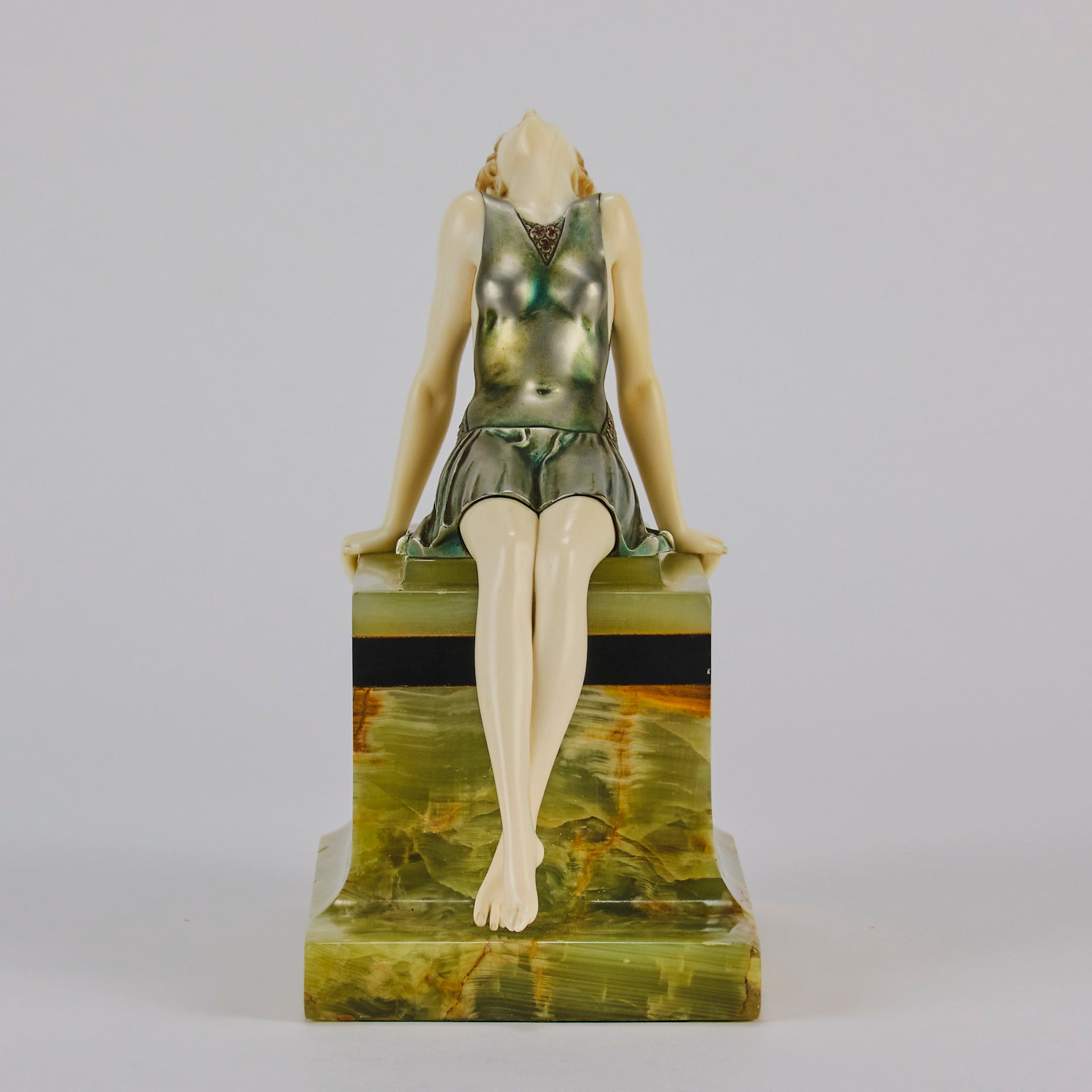 A spectacular early 20th Century Art Deco cold painted bronze and hand carved ivory figure of a beautiful young woman in period attire relaxing on a shaped green onyx and black marble seat, as she enjoys the caressing warmth and tanning rays of the sun high above. The figure with hand carved head, arms and legs and cold painted bronze dress. Raised on a large green onyx and black marble base and signed F Preiss