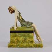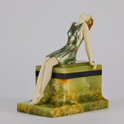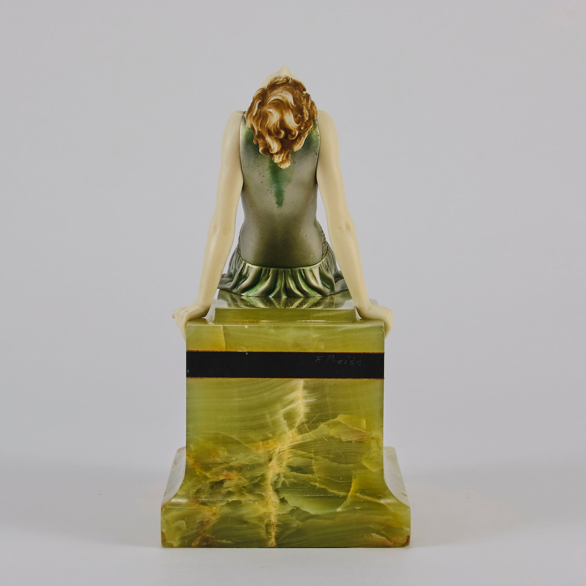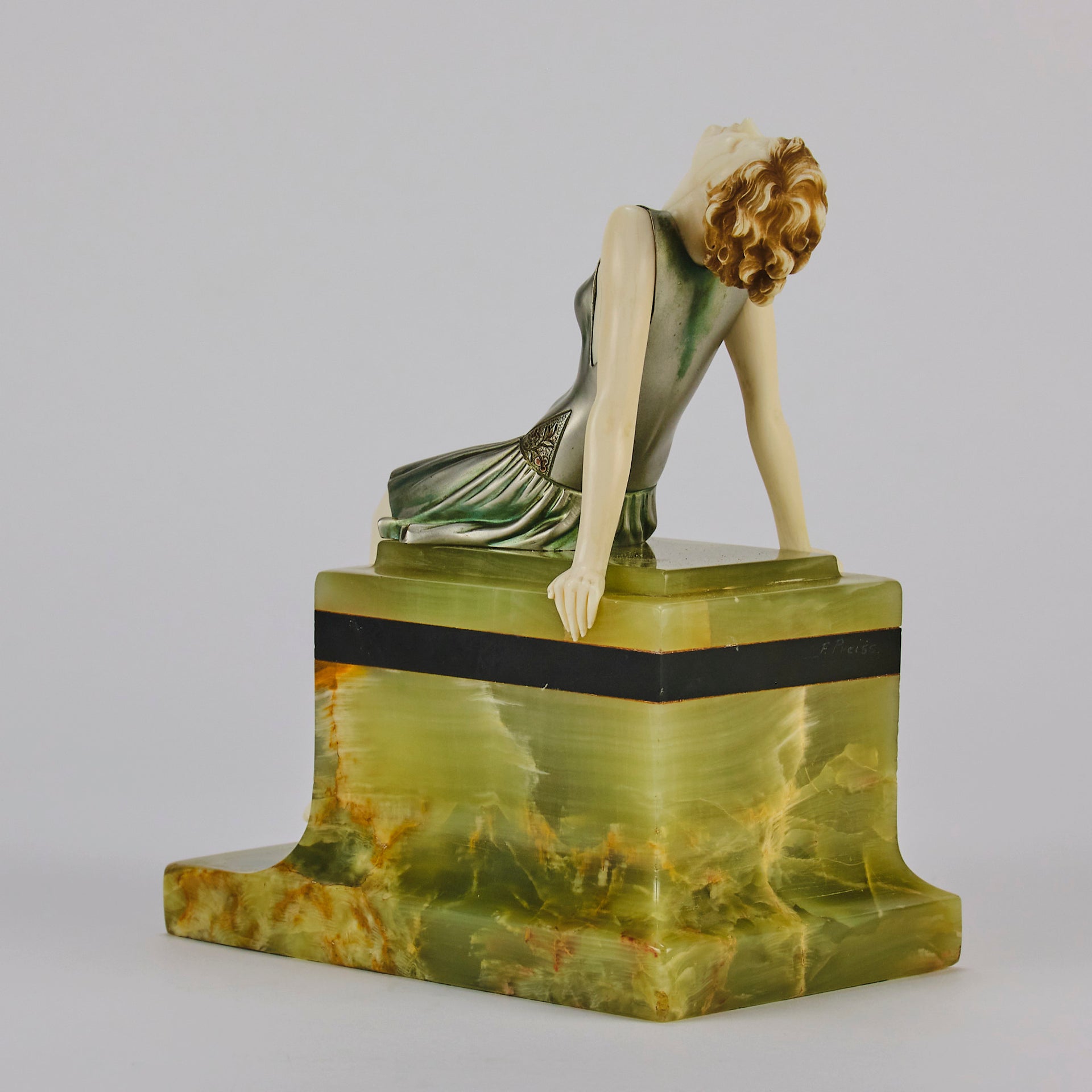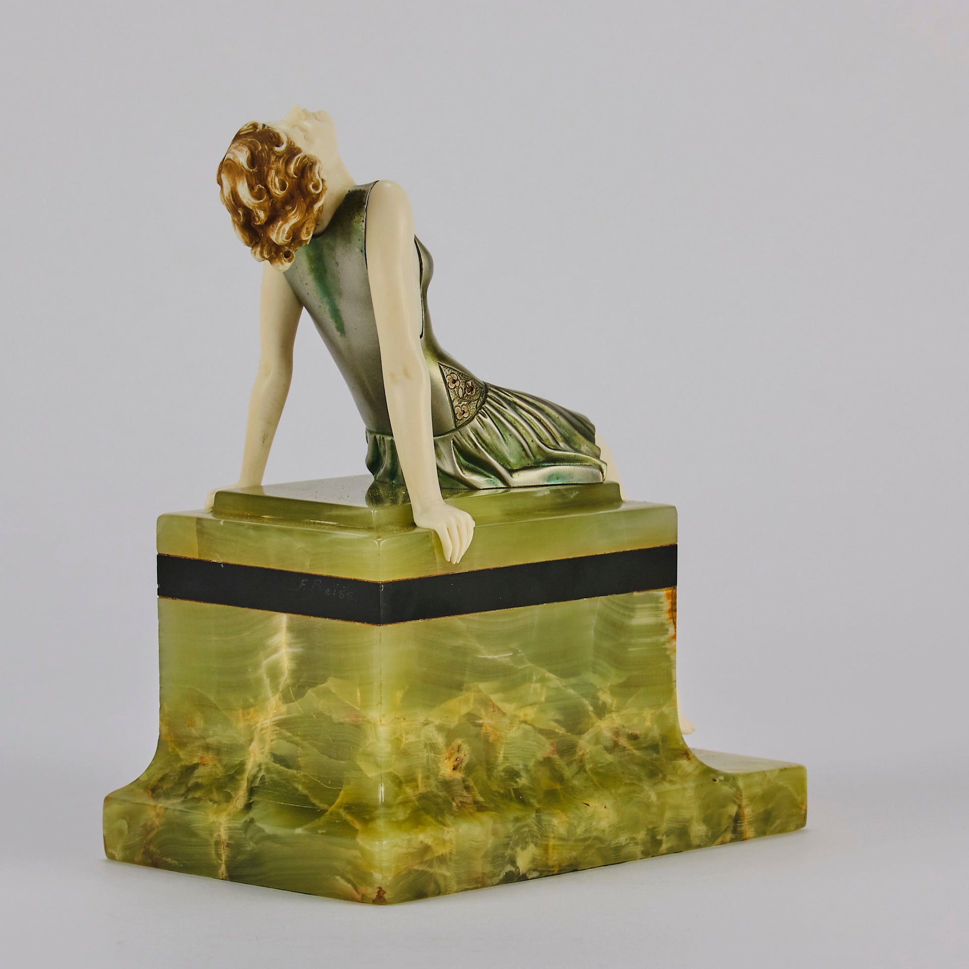 A spectacular early 20th Century Art Deco cold painted bronze and hand carved ivory figure of a beautiful young woman in period attire relaxing on a shaped green onyx and black marble seat, as she enjoys the caressing warmth and tanning rays of the sun high above. The figure with hand carved head, arms and legs and cold painted bronze dress. Raised on a large green onyx and black marble base and signed F Preiss
