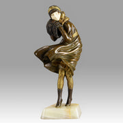 An exquisite early 20th Century Art Deco cold painted bronze and ivory figurine of a young woman in a full length coat battling against the wind with excellent hand finished surface detail and fine colours, signed Chiparus and raised on a shaped variegated cream onyx plinth.