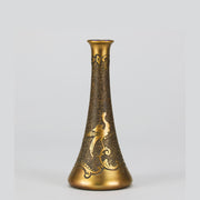 An attractive late 19th Century Art Nouveau gilded blue glass cabinet vase of trumpet form with exquisite hand finished surface design and fine colour, signed VSL and with original retail label to base
