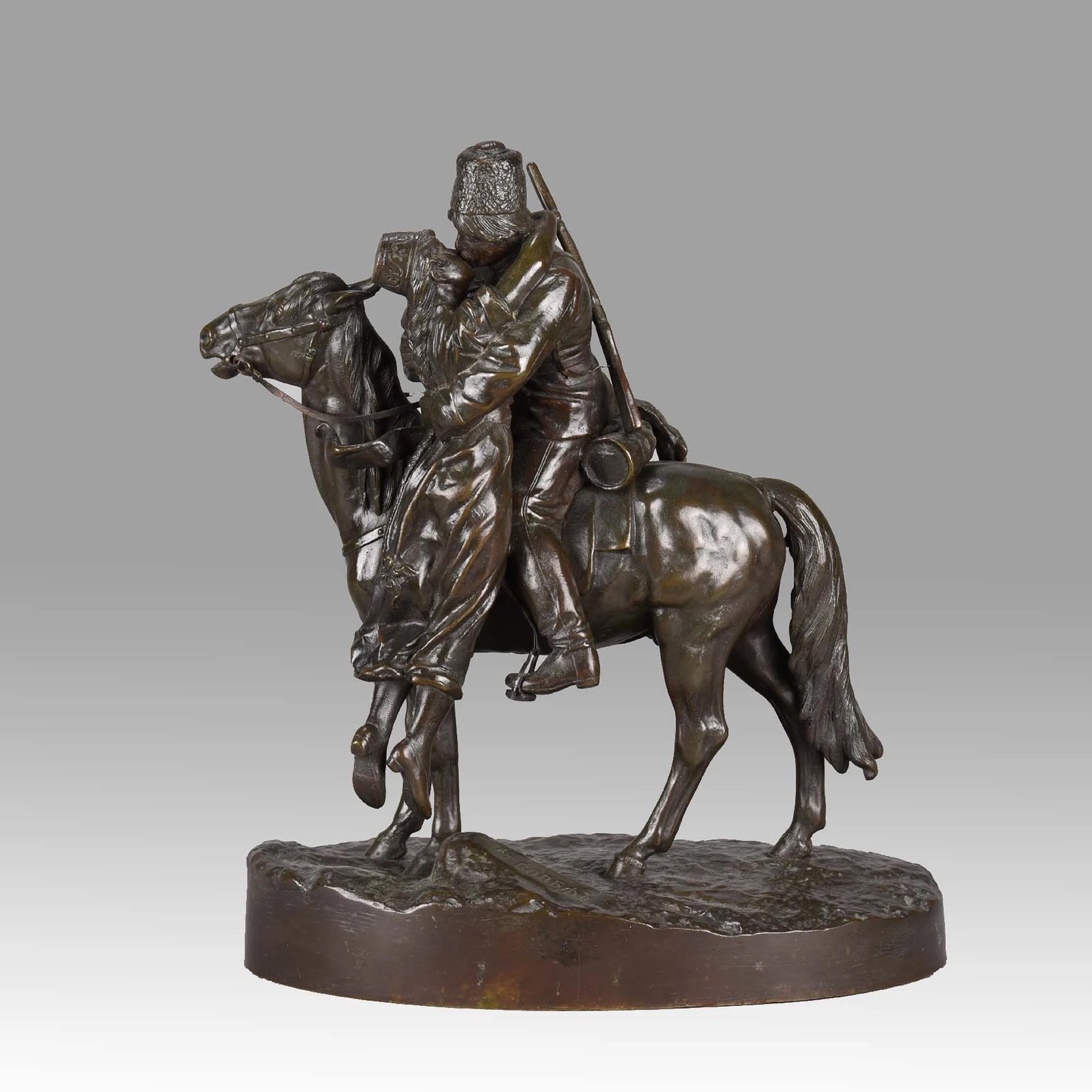 Excellent late 19th Century bronze group of a Cossack mounted on his steed embracing his lover as he says 'farewell' to her with intricate hand chased surface detail and good rich dark colour, raised on an oval naturalistic base and signed in cyrillic