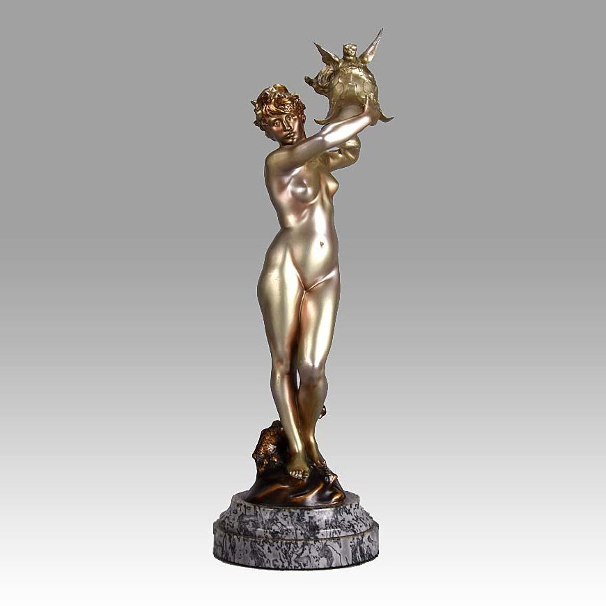 A fabulous early 20th Century Art Deco cold painted silver bronze figure of a beautiful woman standing naked on a naturalistic mound as she holds aloft a winged dragon helmet with a dragon wrapped around her legs. The bronze surface with excellent colour and very fine detail, signed Hannaux