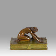 Sensuous early 20th century Austrian bronze erotic figure of a naked beauty kneeling upon a book with fine cold painted colour and good detail, signed with the Bergman 'B'