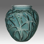 An impressive early 20th Century French Art Deco clear and frosted glass vase, with a landscape of blue stained branches and raised figures of green stained grasshoppers. The vase with fine hand finished detail, signed R Lalique.