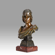 An enchanting late 19th Century French Art Nouveau bronze bust of a beautiful classical prophetess with excellent detail and rich multi-coloured patina, raised on a rouge griotte marble base, titled to the fore, signed E Villanis and with Societe des Bronzes foundry stamp.