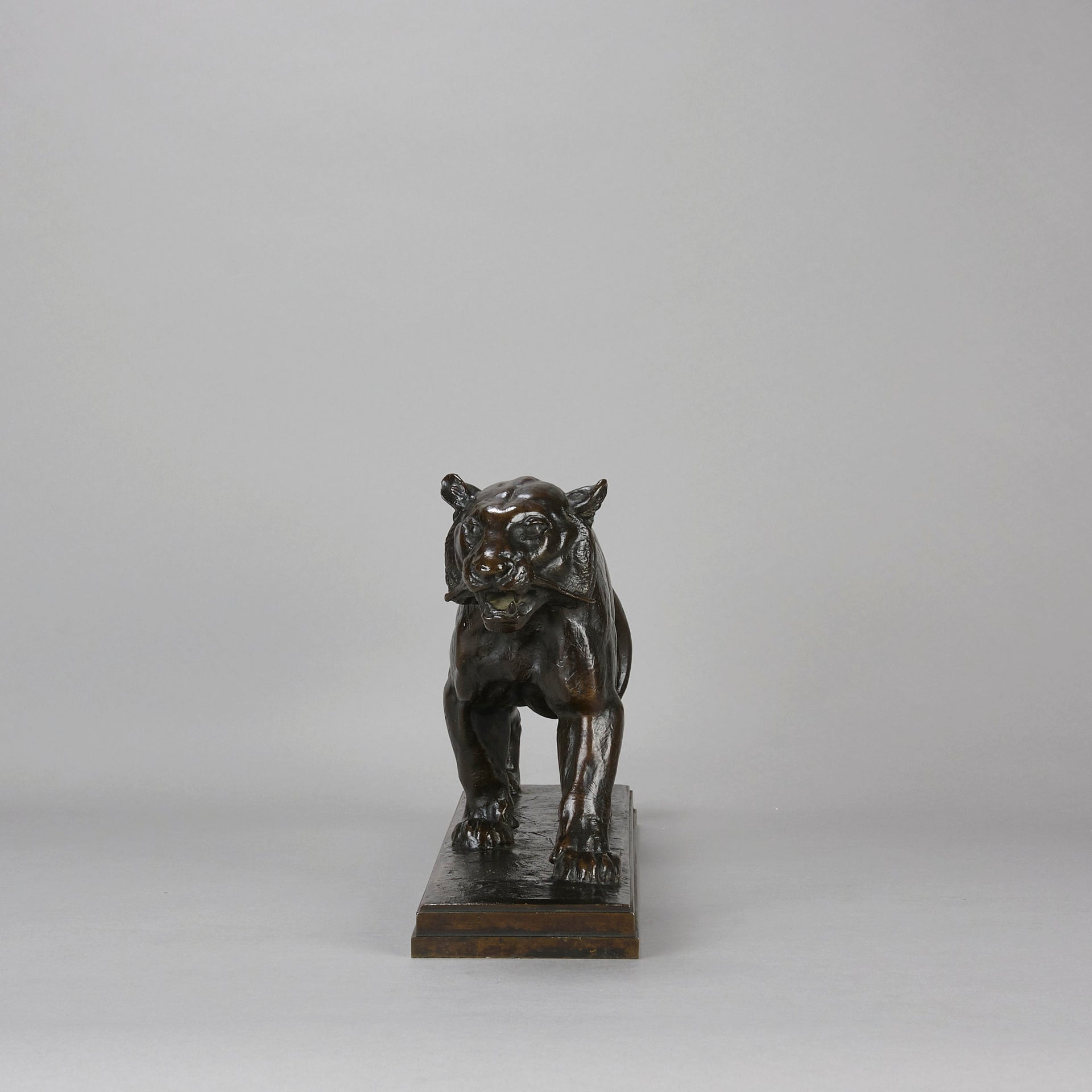 An impressive mid 19th Century Animalier bronze study entitled 'Tigre qui Marche' by Antoine L Barye - of a walking tiger with excellent rich colour and very fine hand finished surface detail. Raised on an integral base, signed Barye