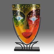 An attractive modernist hand blown glass vase with an abstract design of a woman’s face in variegated bright colours with golden highlights in a tribute to the great artist Pablo Picasso. Raised in a custom made wrought iron stand. A formation of fused pieces of Glass with original Murano sticker