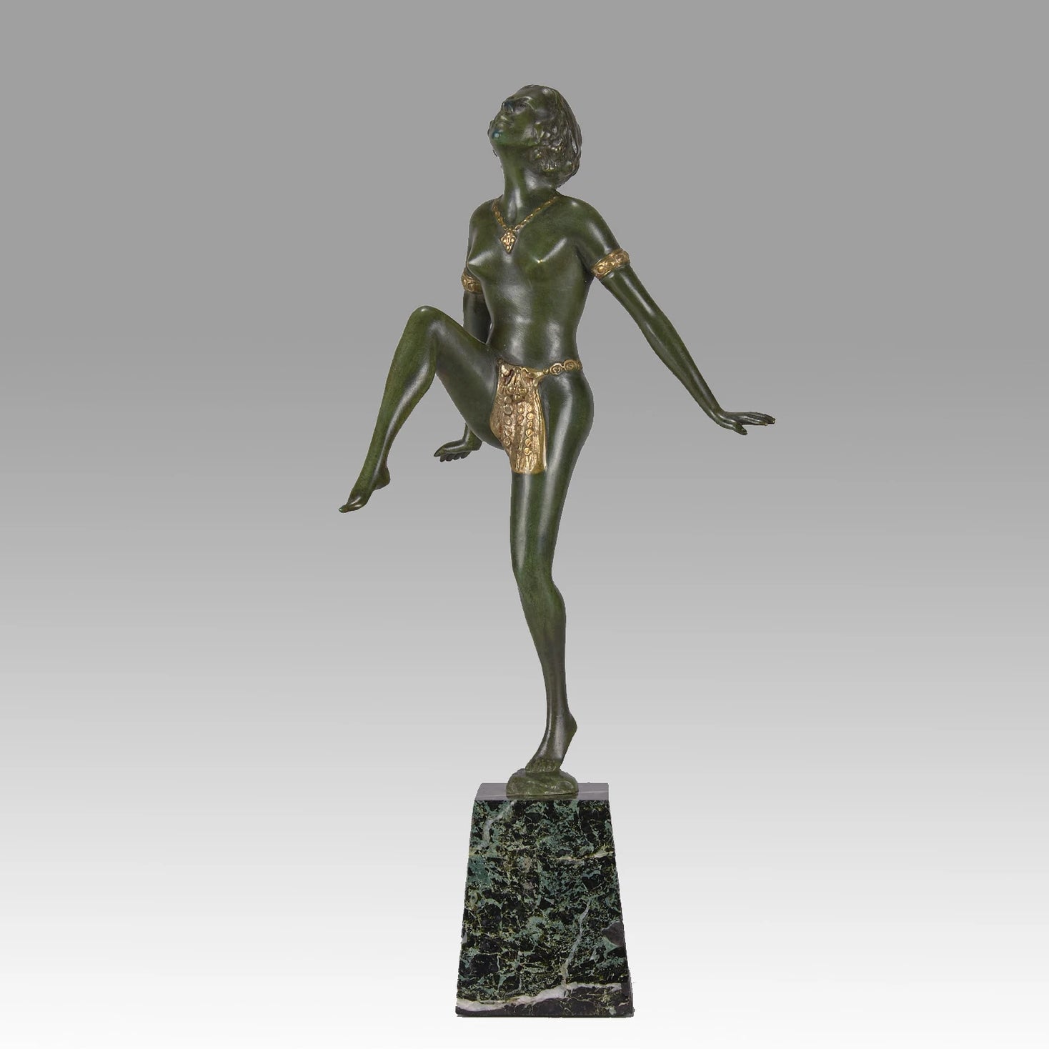 A fabulous early 20th Century cold painted bronze figure of an Art Deco Dancer dressed in a revealing costume in an energetic pose with fine colour and excellent hand finished surface detail raised on a shaped base, signed indistinctly