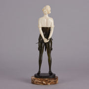 An erotically charged early 20th century Art Deco bronze and ivory figure of a seductively dressed young lady holding a riding crop behind her back standing in a domineering pose and wearing a revealing basque with gartered stockings, raised on an oval shaped marble plinth, signed Zach.