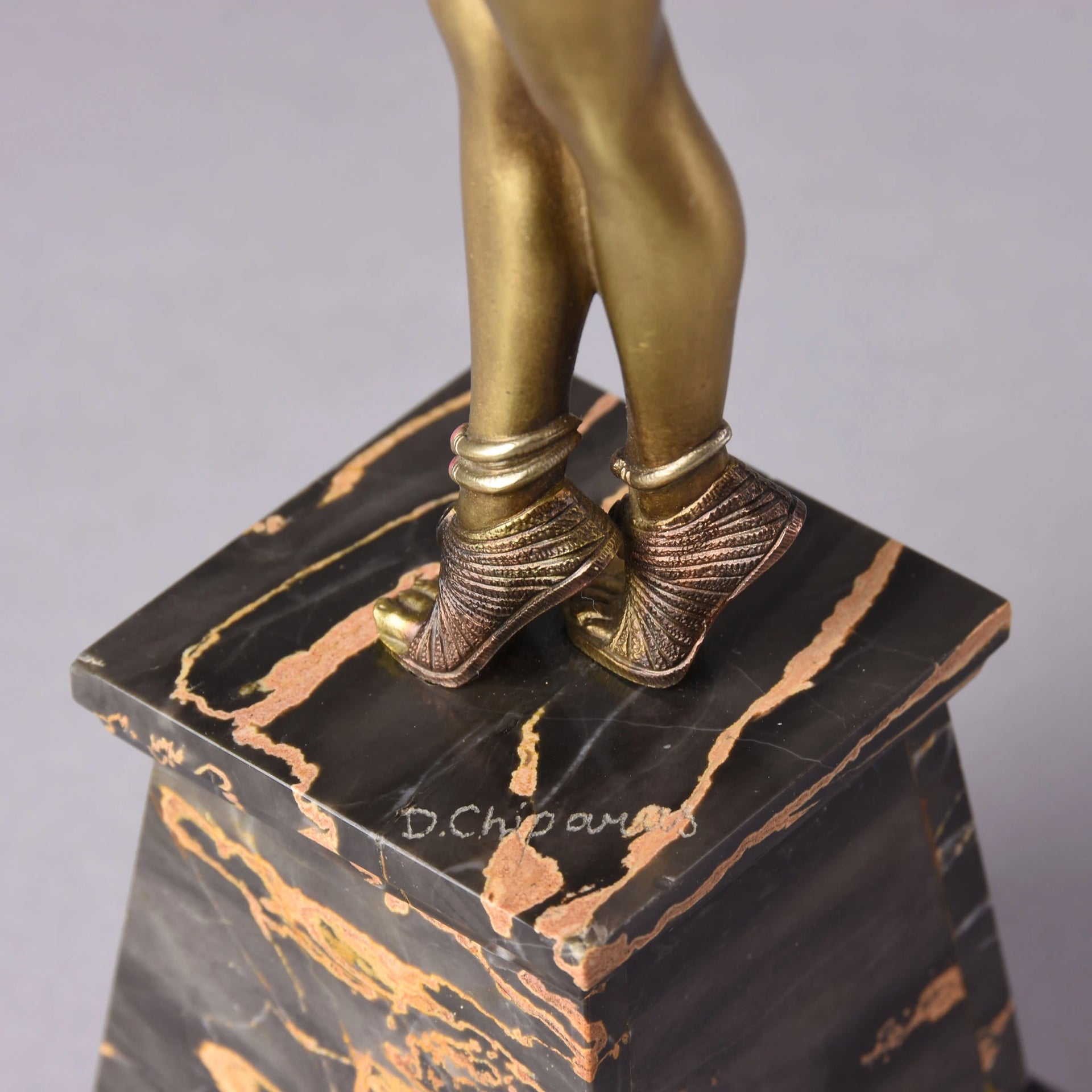 Chiparus attended the music halls and purchased all the magazines which illustrated the dancers. His wife and occasional models posed for him as he varied some of the photographed illustrations, never wasting a good attitude, this gave Chiparus an inexhaustible supply of material and influence from which he derived his most flamboyant, exotic and dramatic statues, frozen in spectacular attitudes, tall and sensuous. A Chiparus figure repertoire symbolises a brief golden era and the sculptures that survived stand graceful, self-confident and proudly decorative.