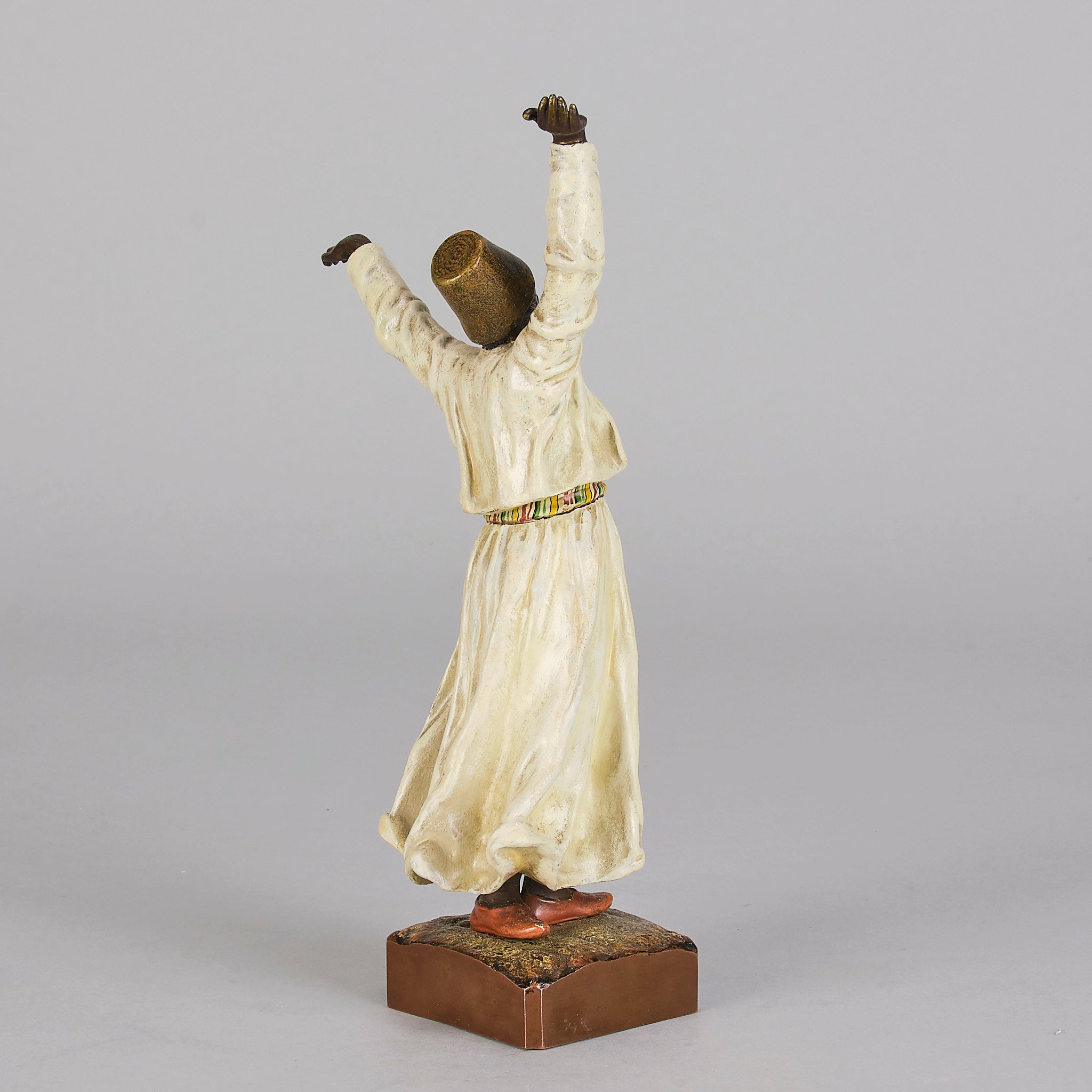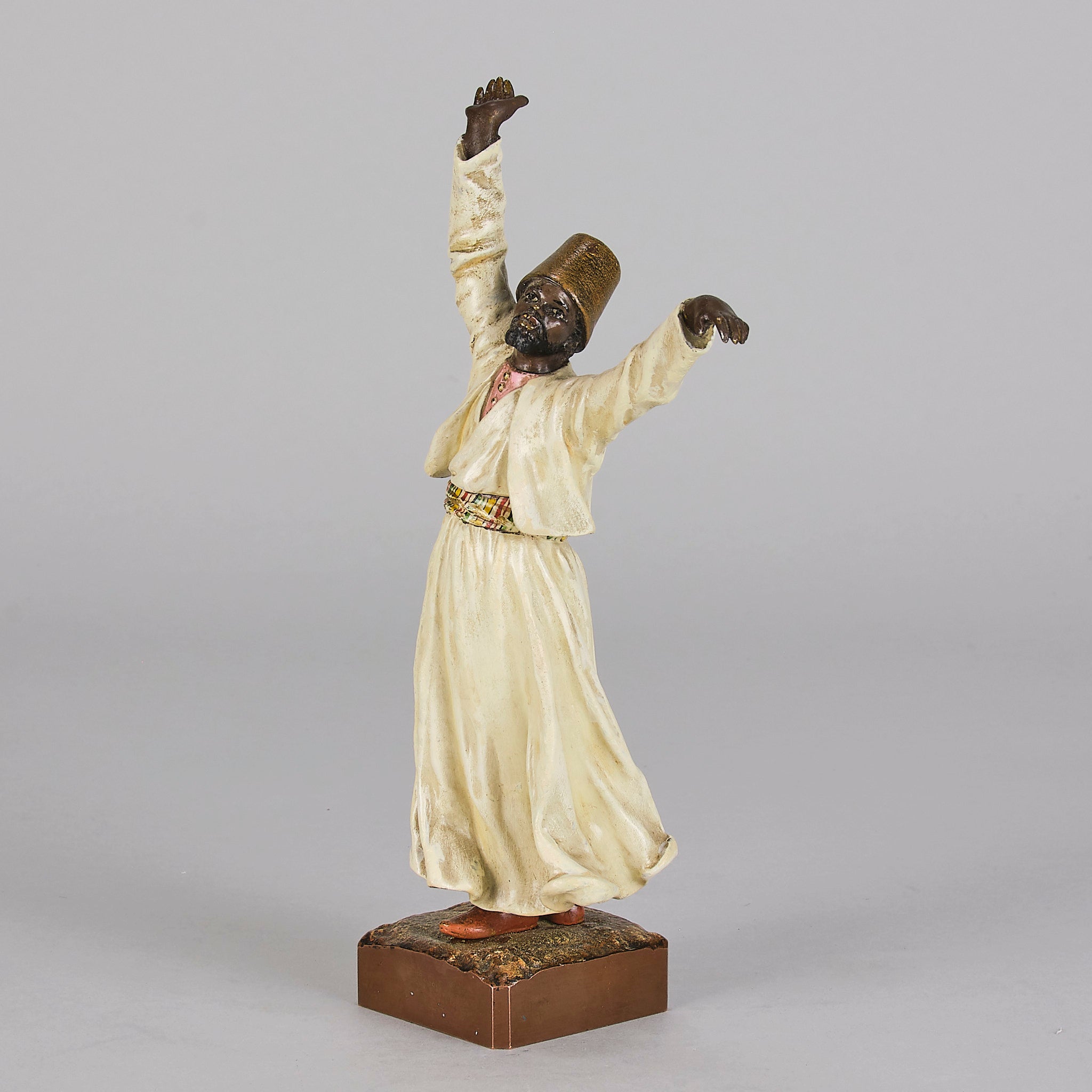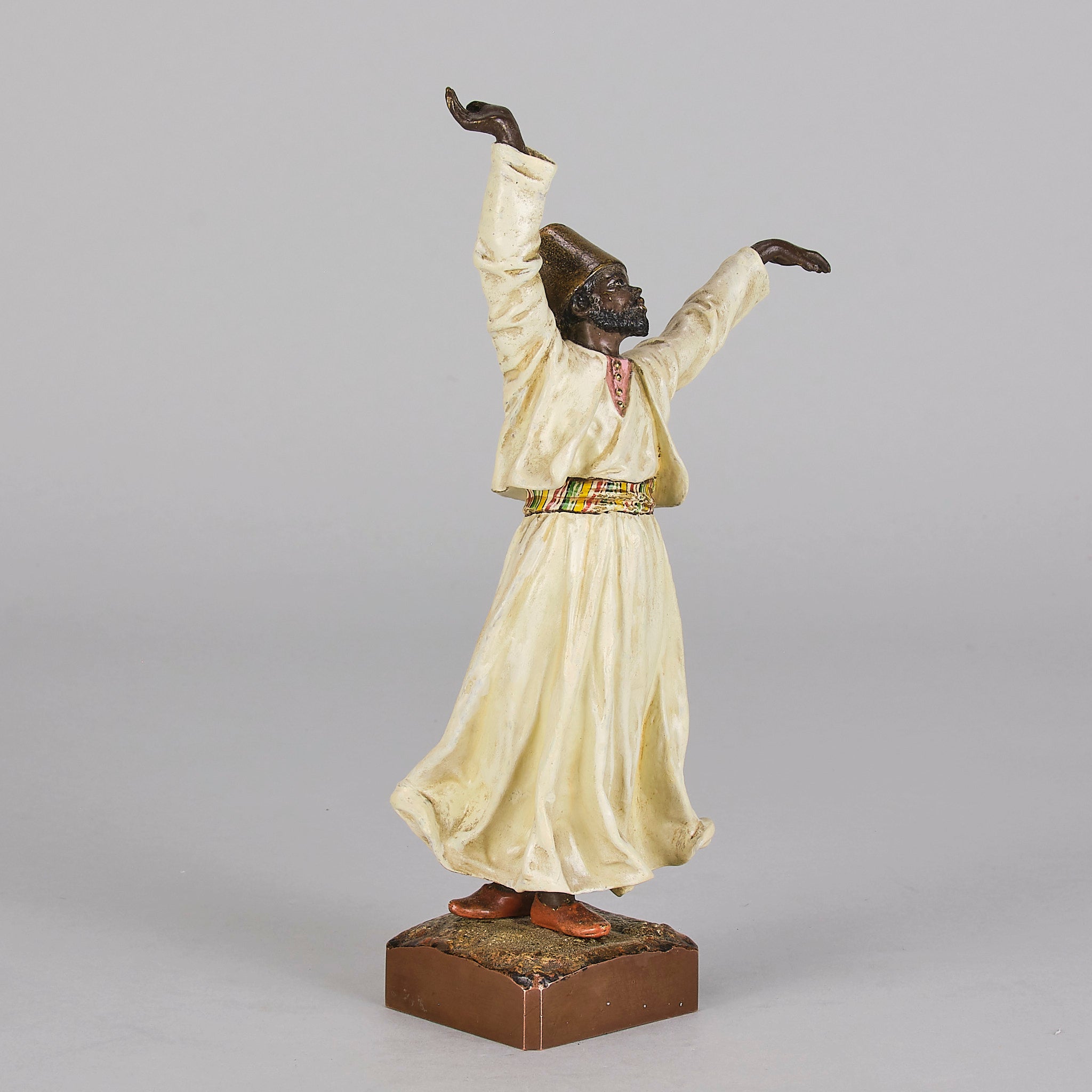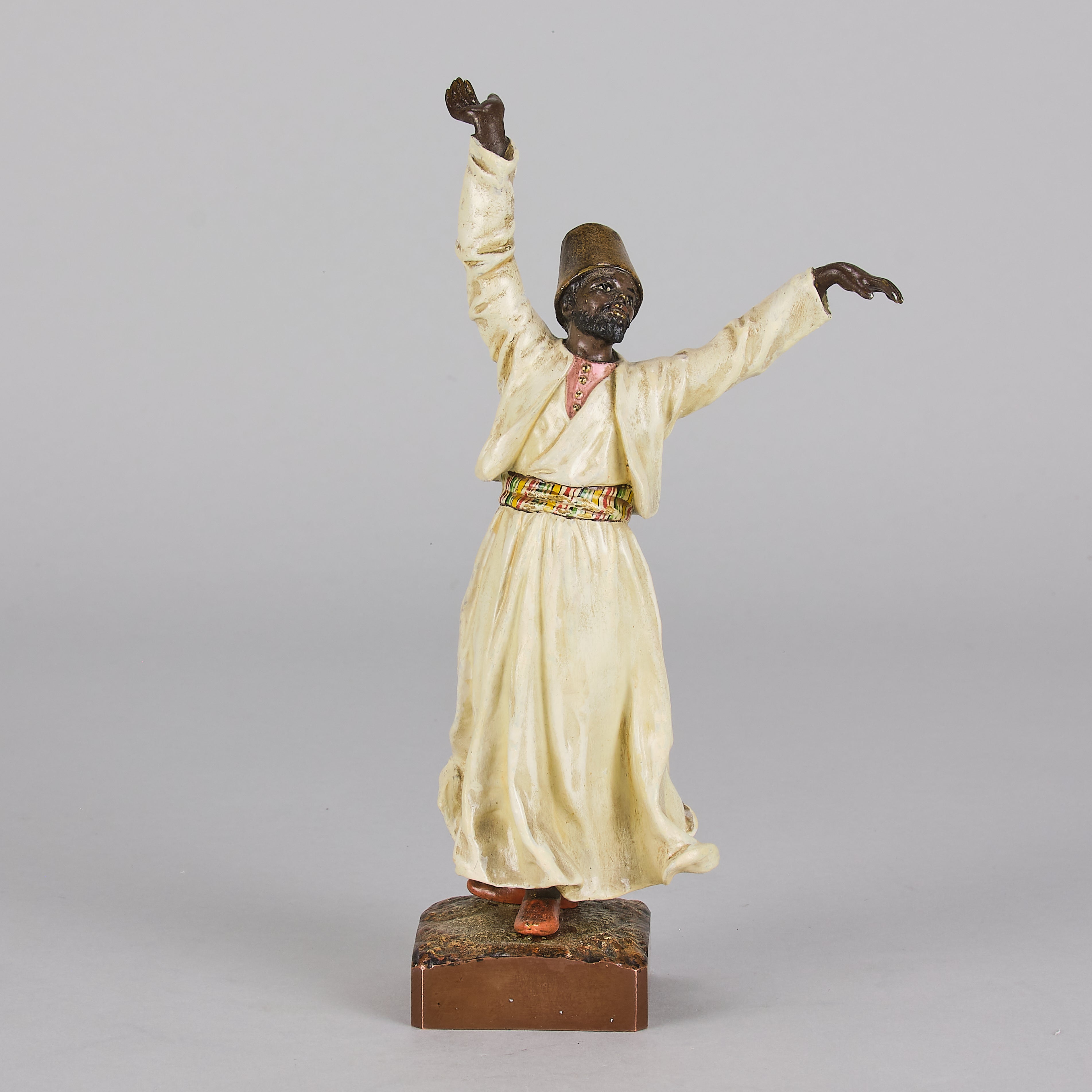 An excellent early 20th Century cold painted Vienna Bronze study of a Whirling Dervish with his arms lifted high as he dances in a turning circular motion to achieve a trance like state. The bronze with fine naturalistic colour and good detail, signed with the Bergman ‘B’ in an amphora vaseand numbered.