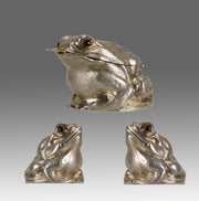 A charming solid silver cruet set modelled as three seated frogs. The set made up of a salt, pepper and mustard pot all with realistic garnet eyes. The mustard pot hinged at the frogs neck to reveal a green glass liner with silver gilt spoon modelled as the frog's tongue. Fully hallmarked with date letter and maker's mark.