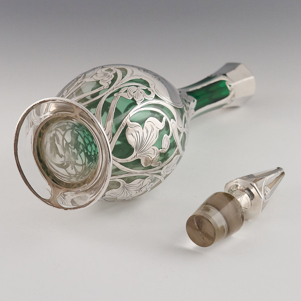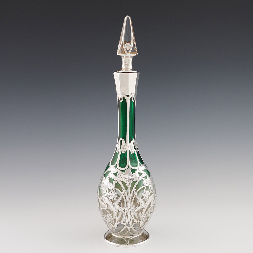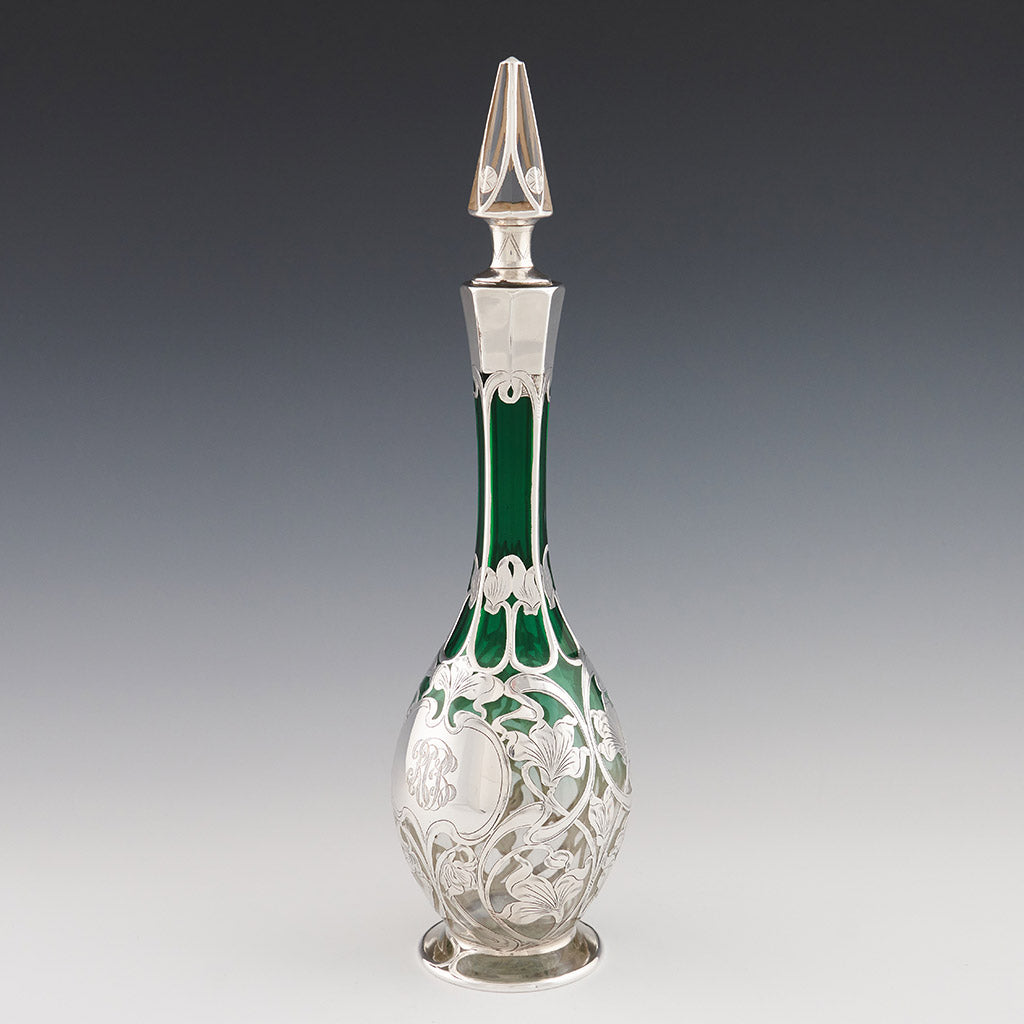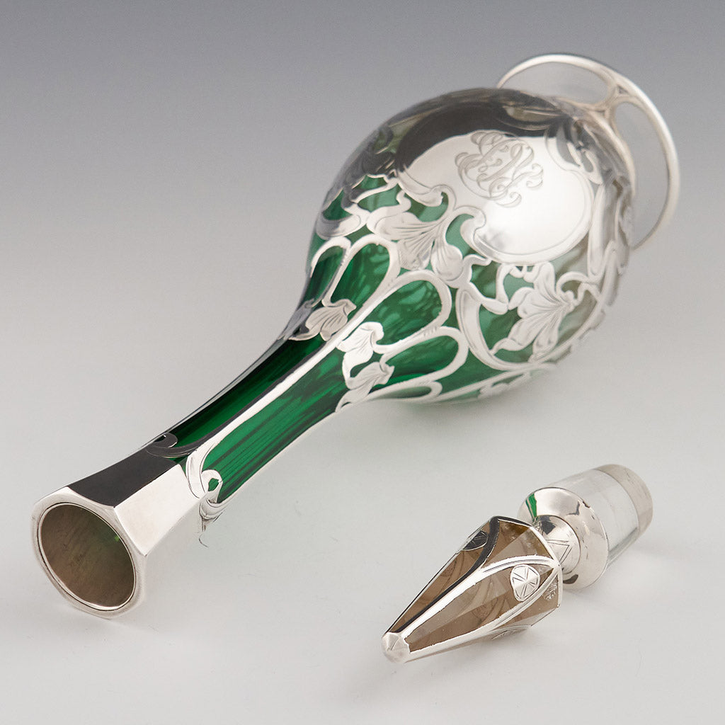 A charming early 20th Century American green glass decanter overlaid with silvered Art Nouveau design with central cartouche panel engraved with initials, complete with matching stopper