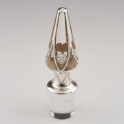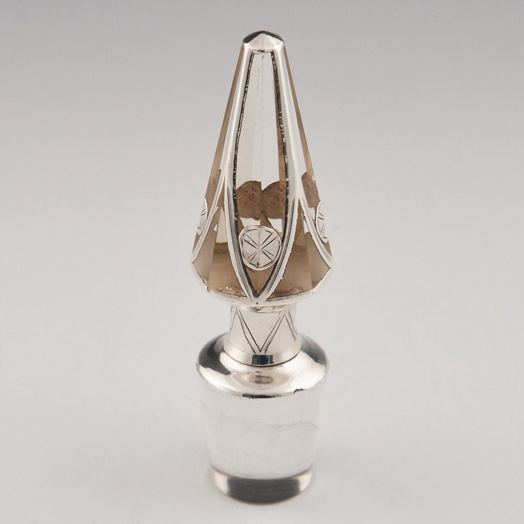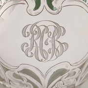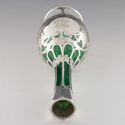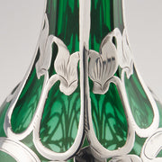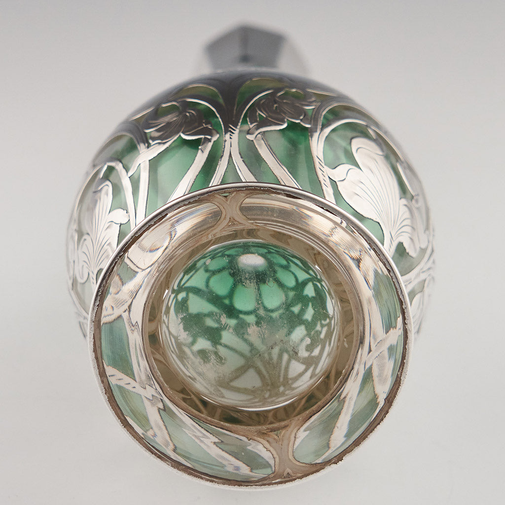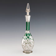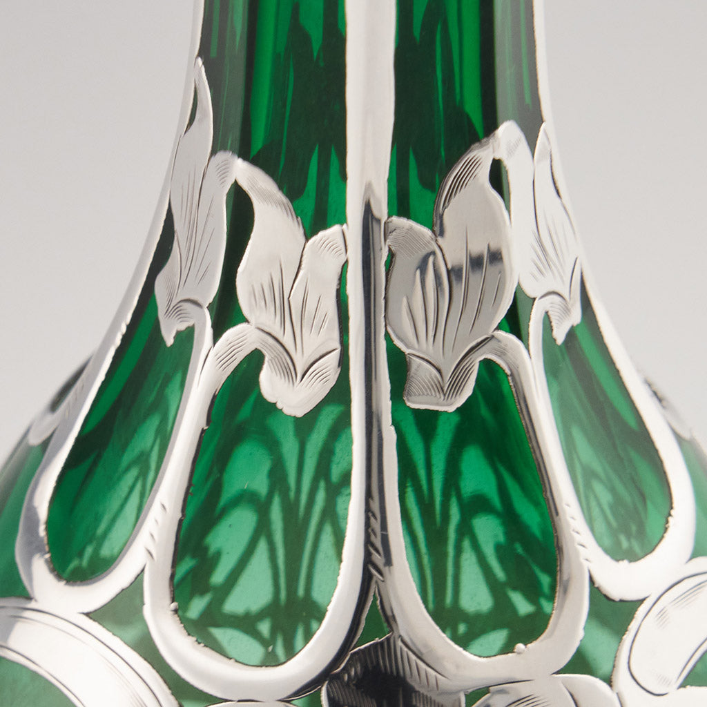 A charming early 20th Century American green glass decanter overlaid with silvered Art Nouveau design with central cartouche panel engraved with initials, complete with matching stopper
