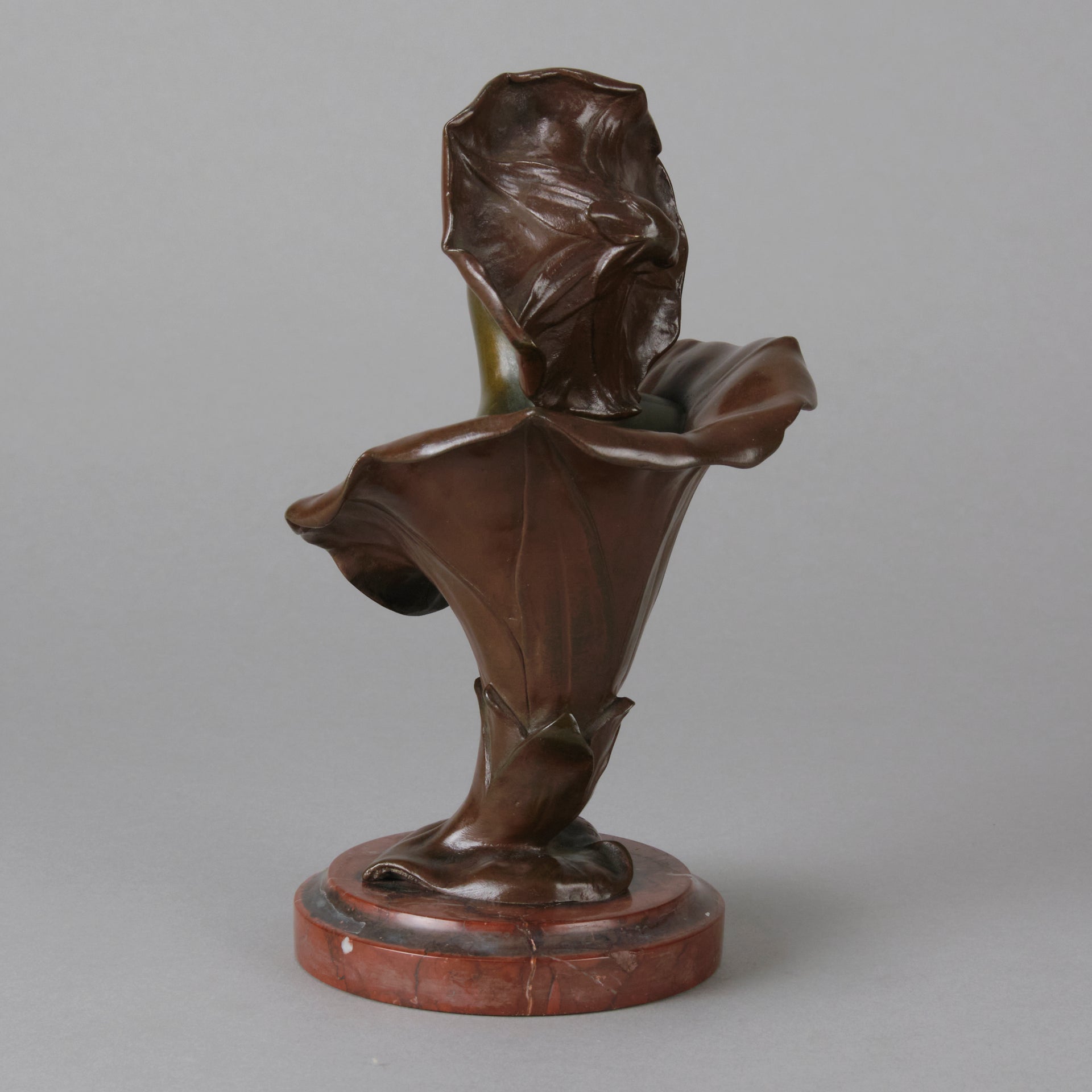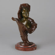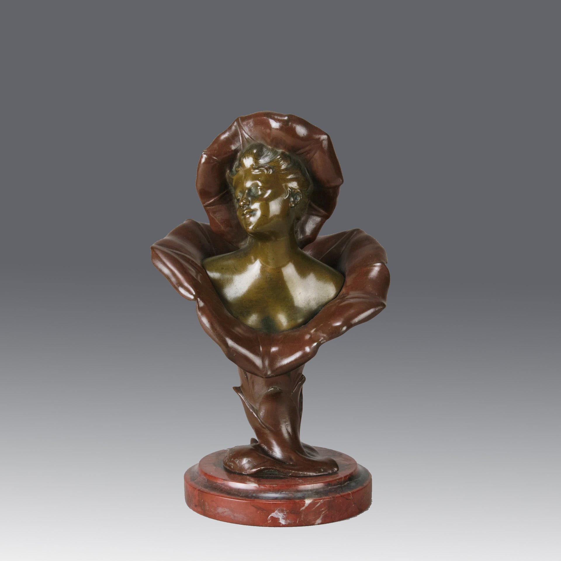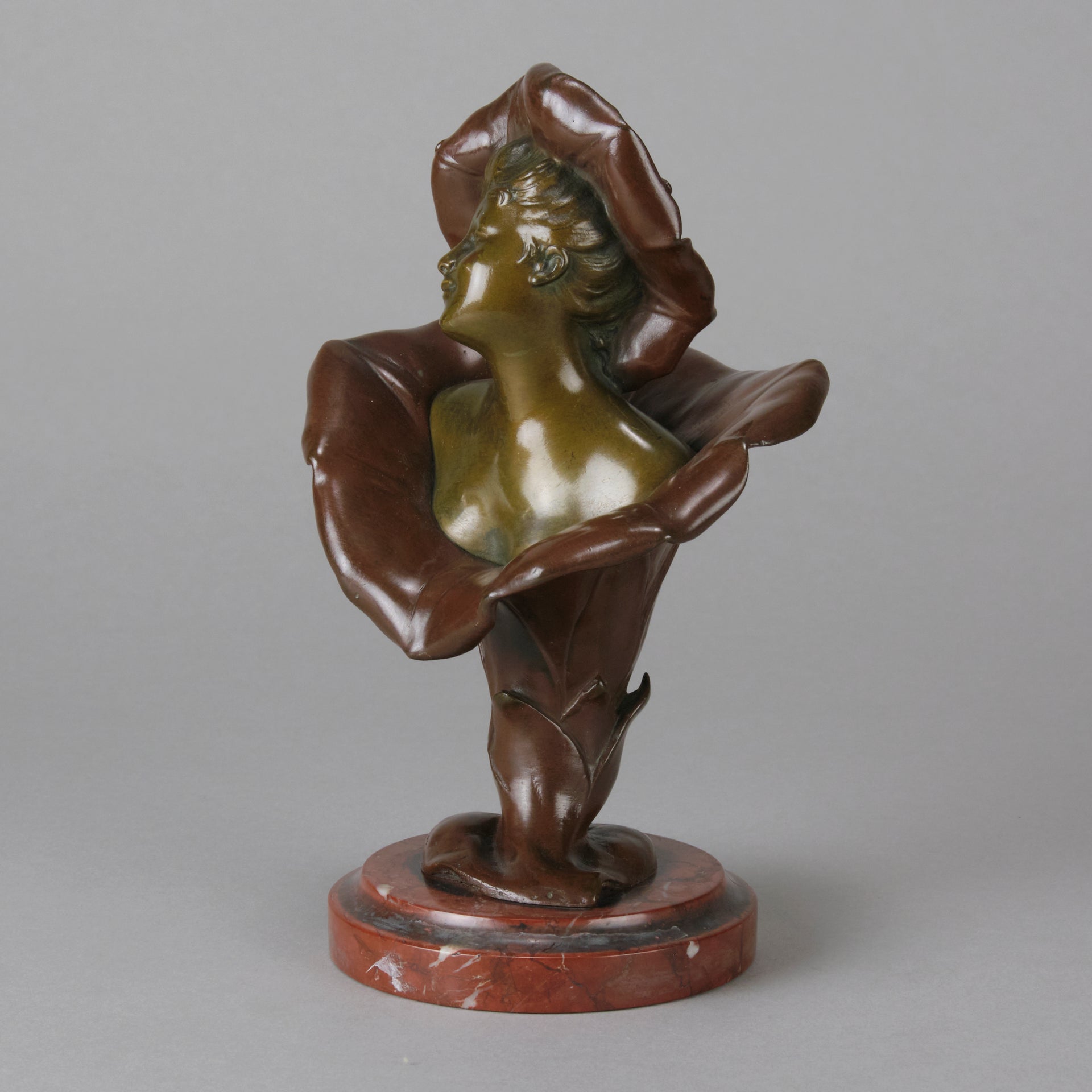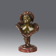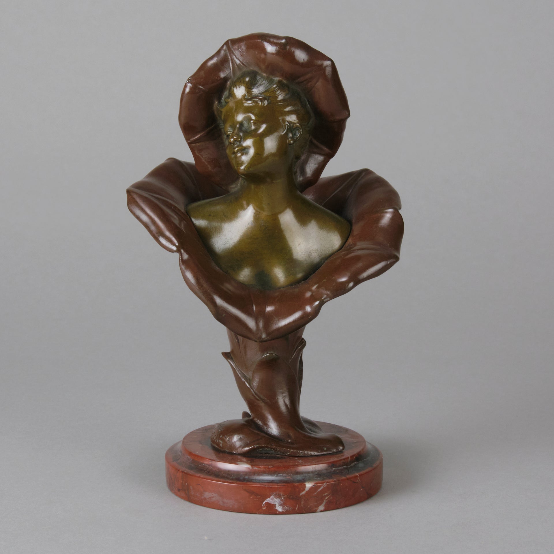A pretty early 20th Century patinated bronze study of the bust of a young woman rising from the centre of a flower with flower headdress, the bronze with good variegated colour and fine detail, raised on a breche griotte circular marble plinth, signed H Godet & inscribed Med d'Or to represent that this subject was a gold medal winner at the Salon des Artistes Francais