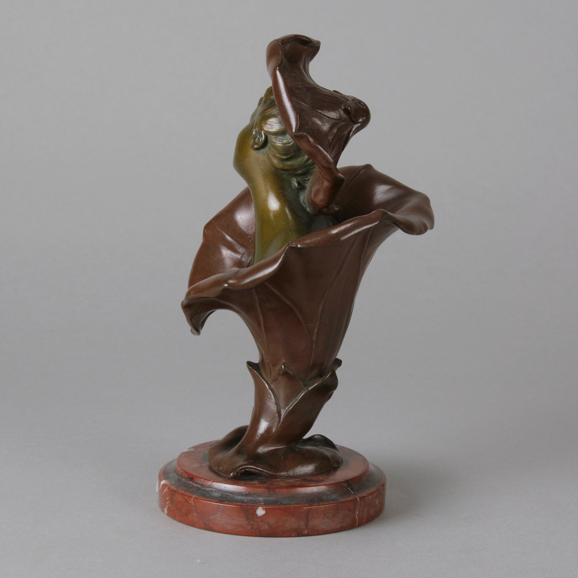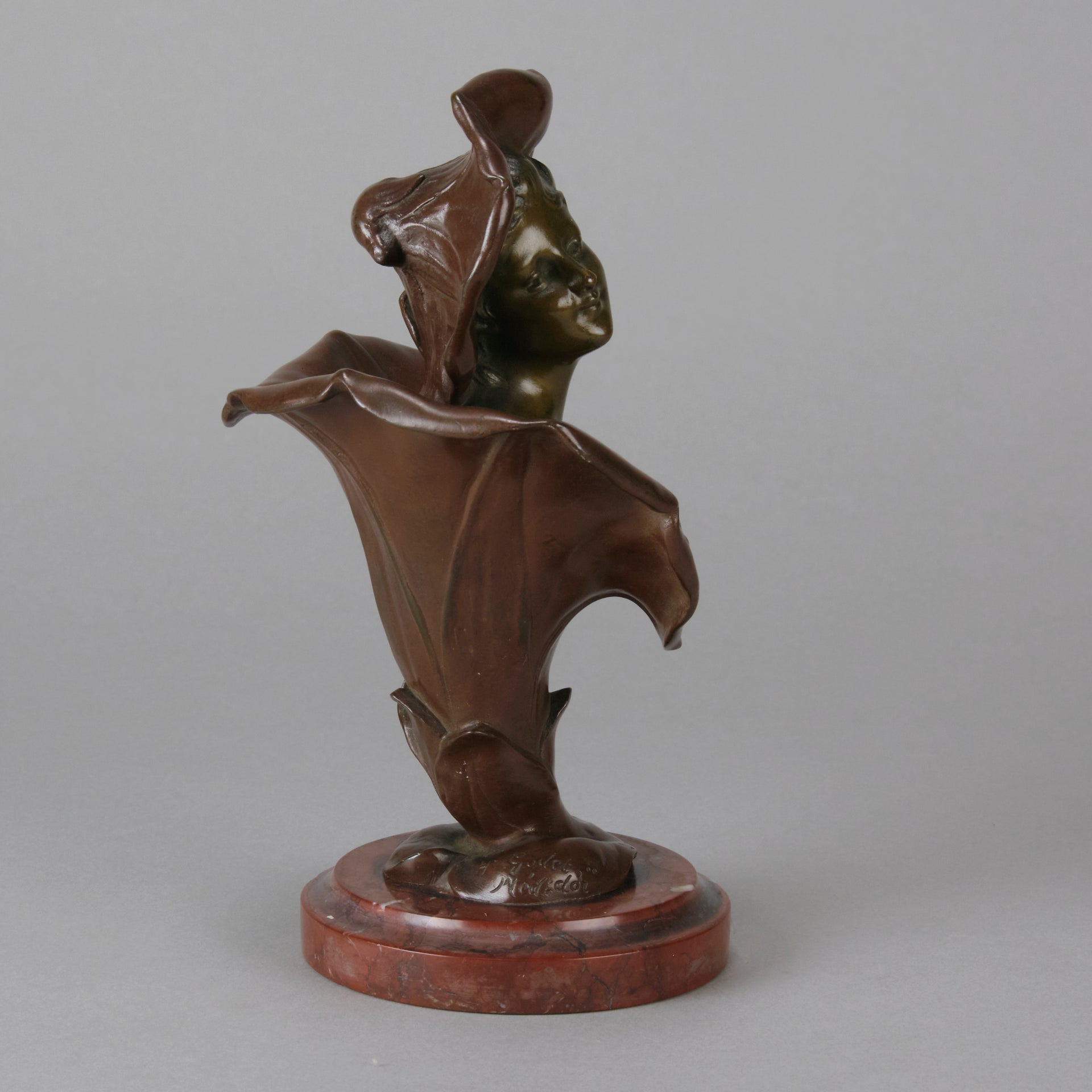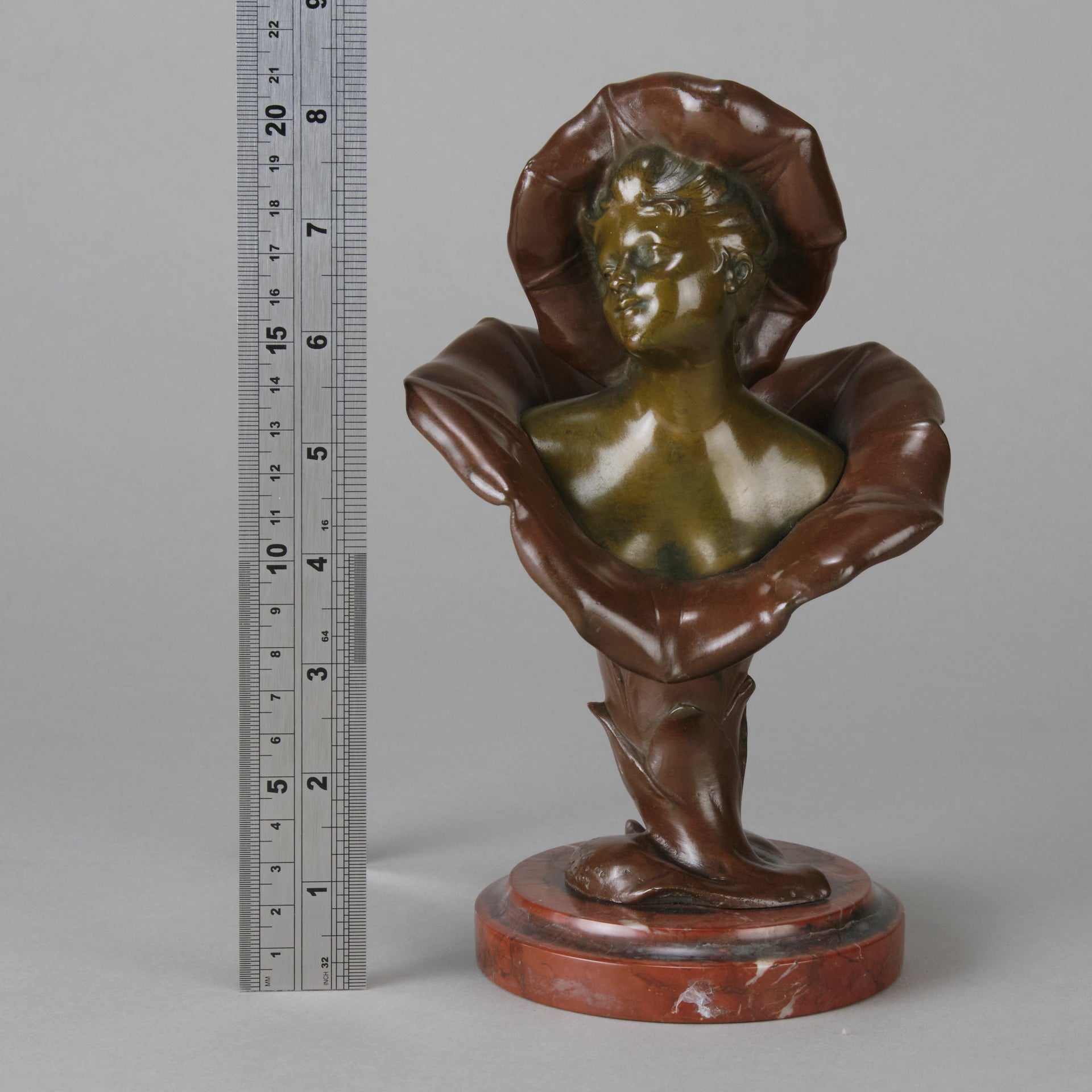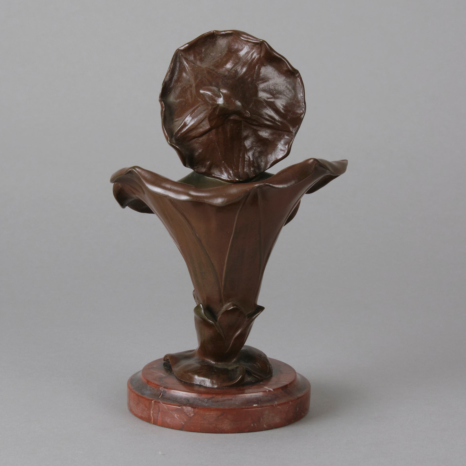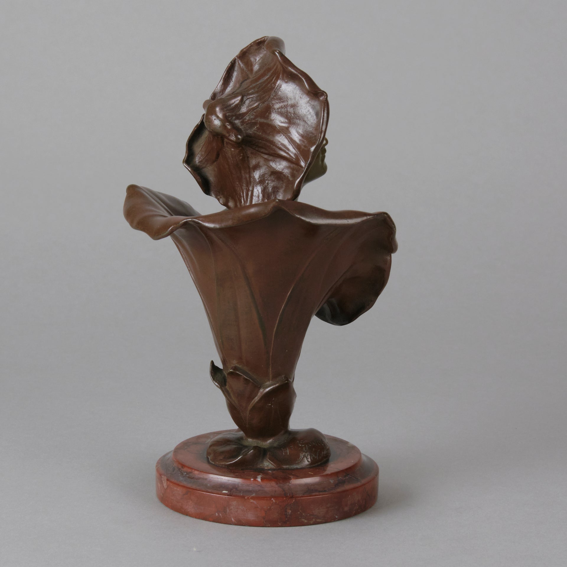 A pretty early 20th Century patinated bronze study of the bust of a young woman rising from the centre of a flower with flower headdress, the bronze with good variegated colour and fine detail, raised on a breche griotte circular marble plinth, signed H Godet & inscribed Med d'Or to represent that this subject was a gold medal winner at the Salon des Artistes Francais