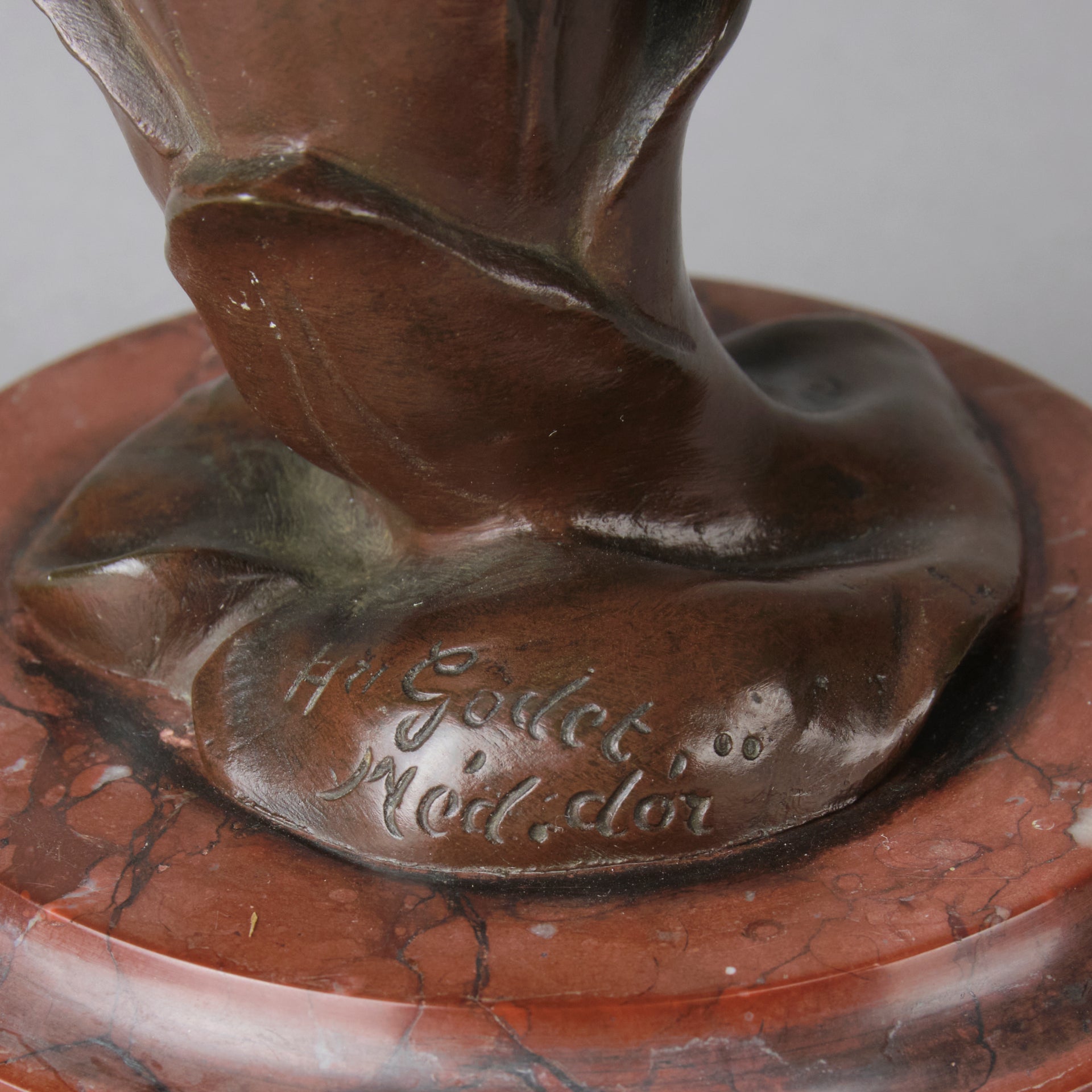 Henri Godet (French 1863 ~ 1937) was born in Paris on 5 March 1863 and died in Vincennes in 1937. Godet was a sculptor and medal engraver. He was known for his popular busts of women decorated with flowers. Godet exhibited regularly at the Salons from 1883 to 1935