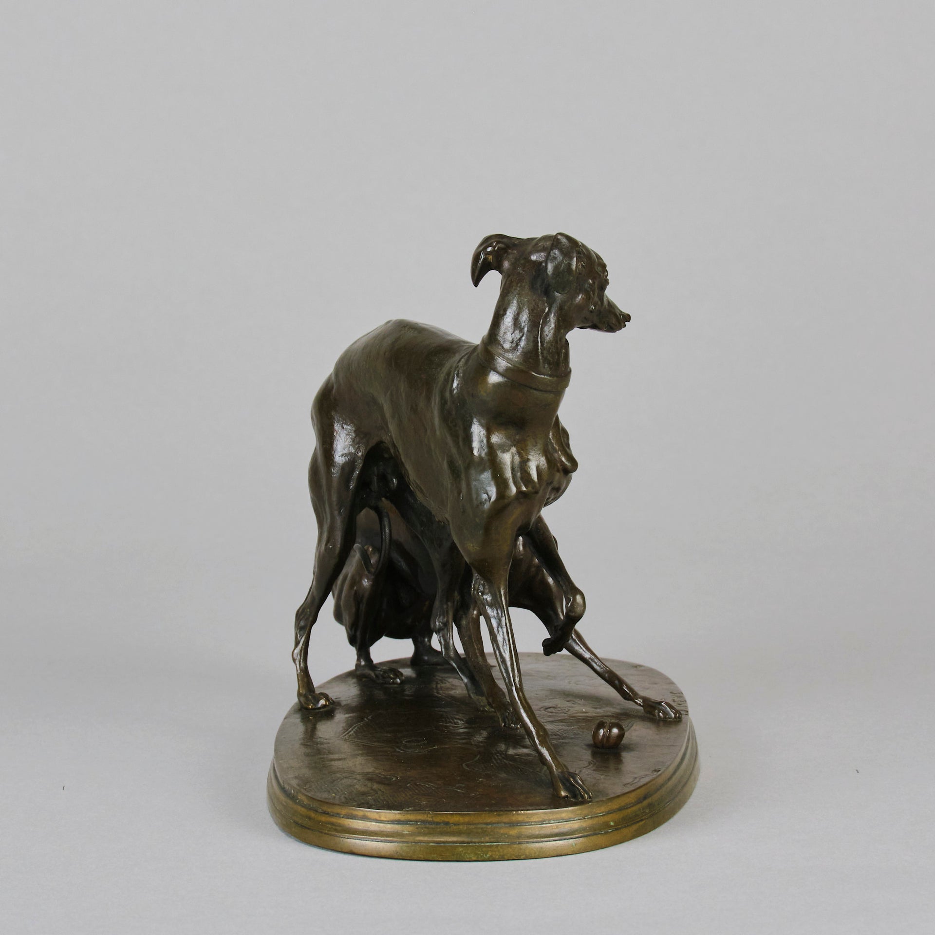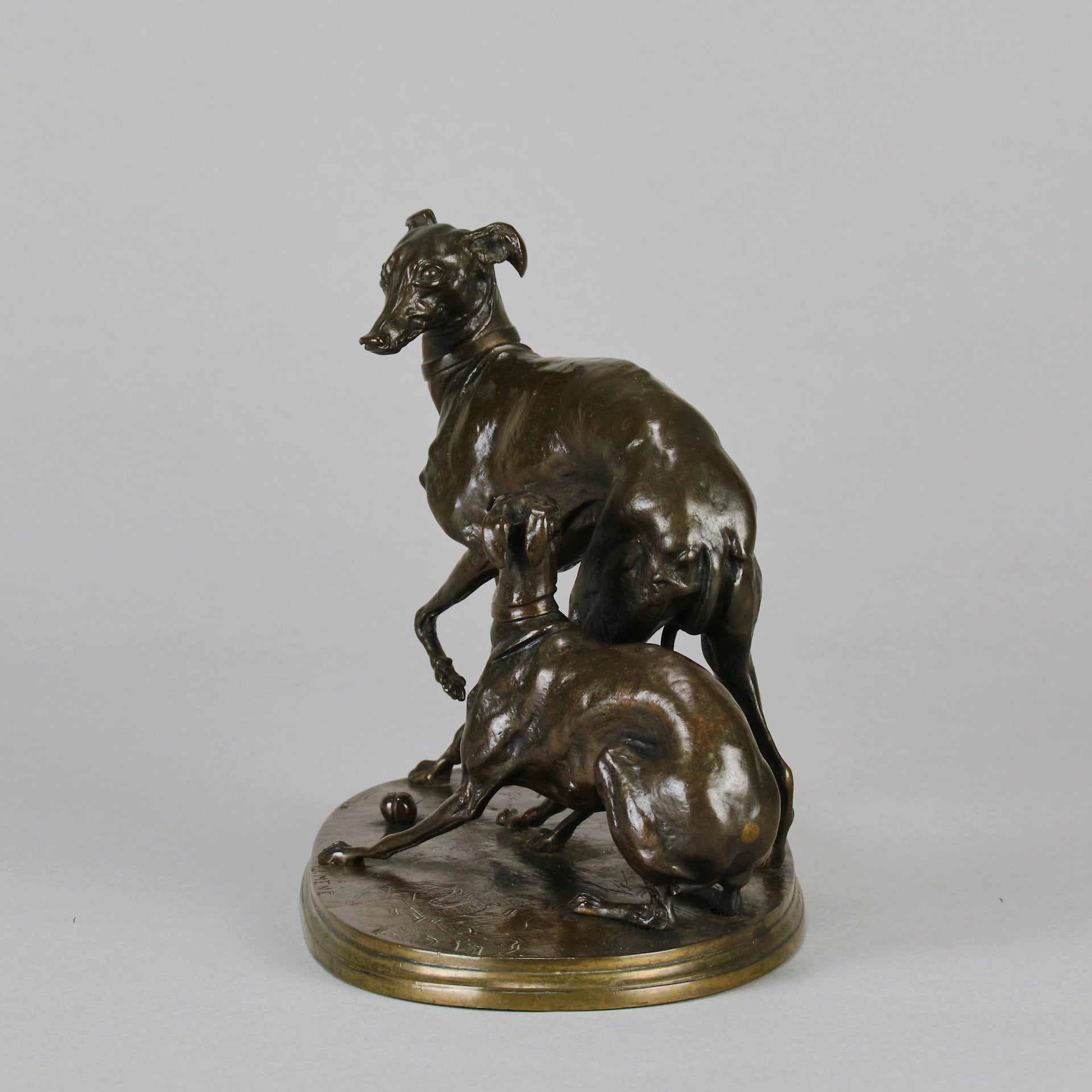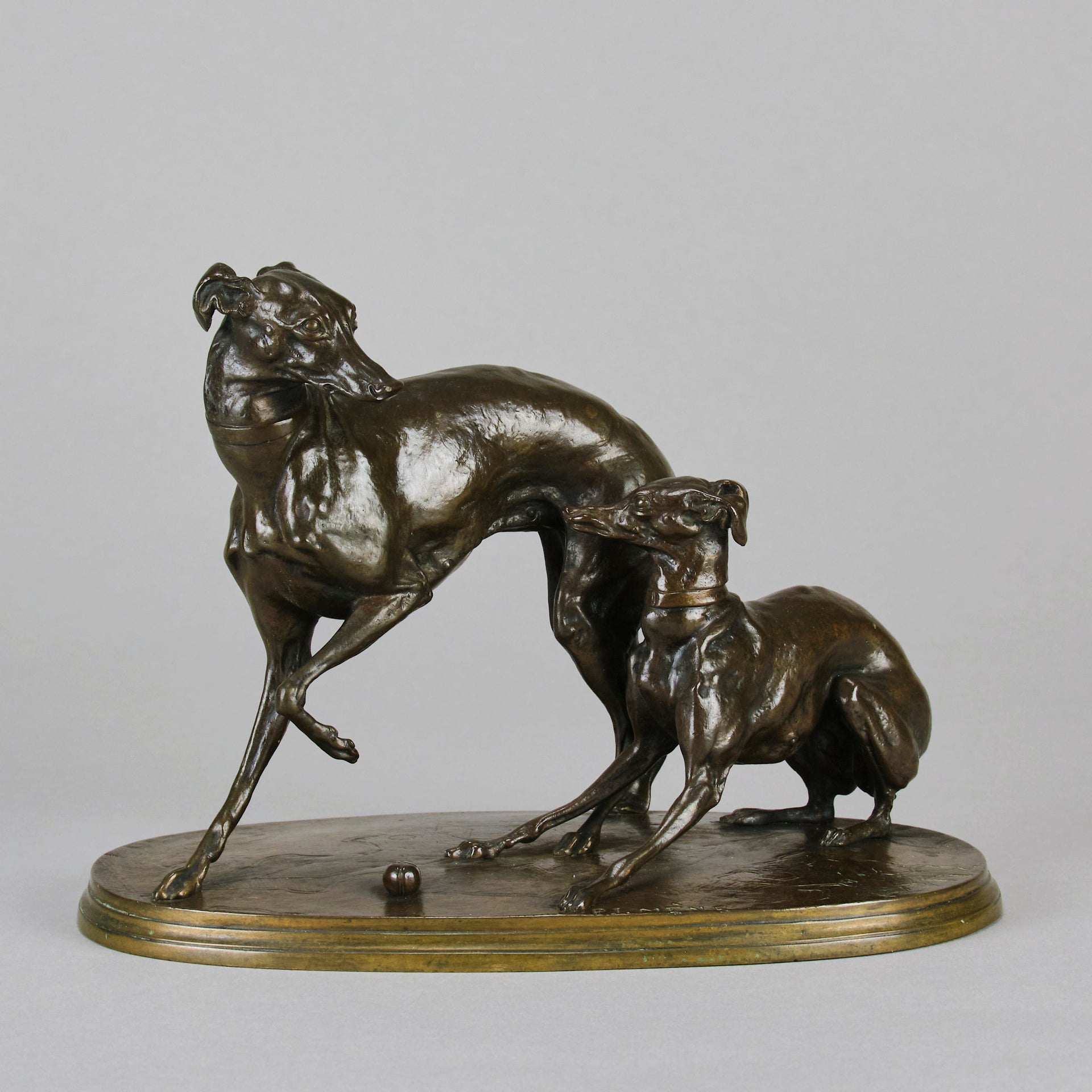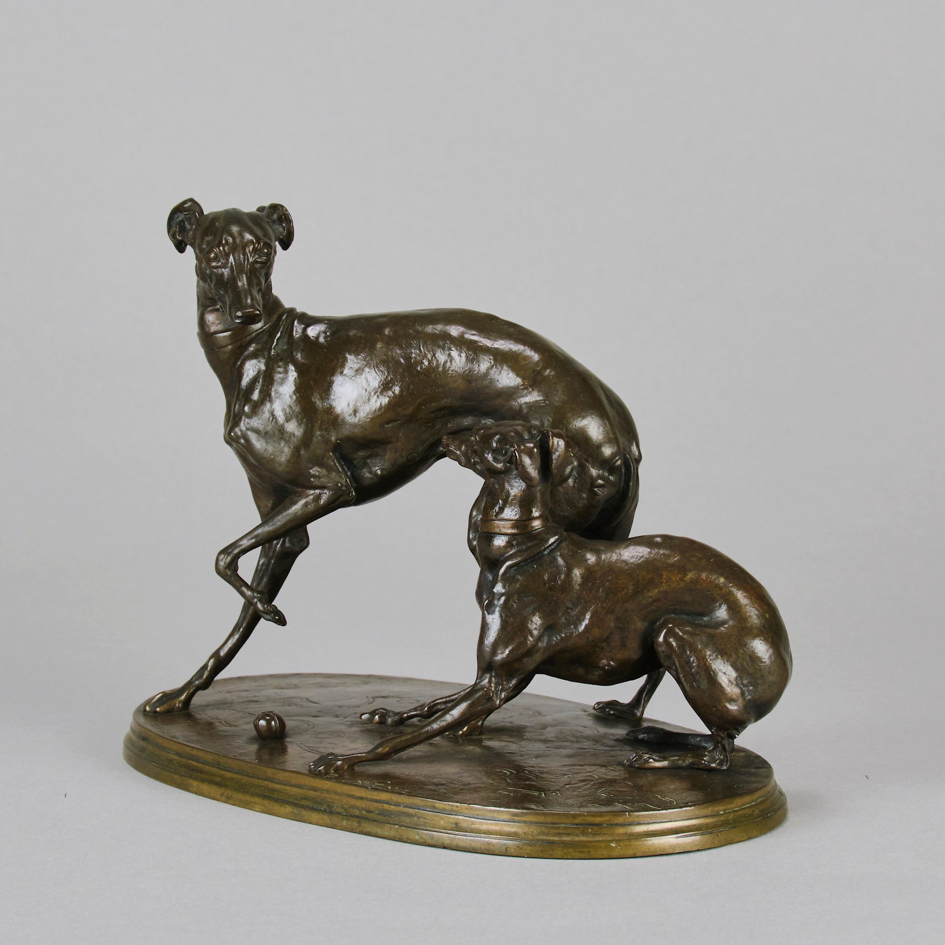 A delightful mid 19th Century French Animalier bronze study of two whippets playing with a ball on a naturalistic base representing a rug in an interior. The surface of the bronze with rich brown patination and fine detailed surface, signed P J MENE and stamped Coalbrookdale and BRONZE