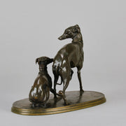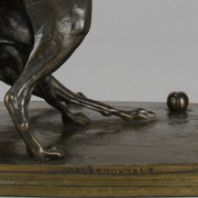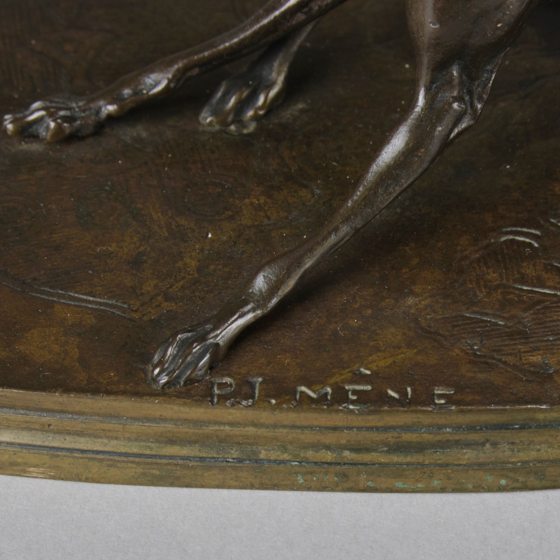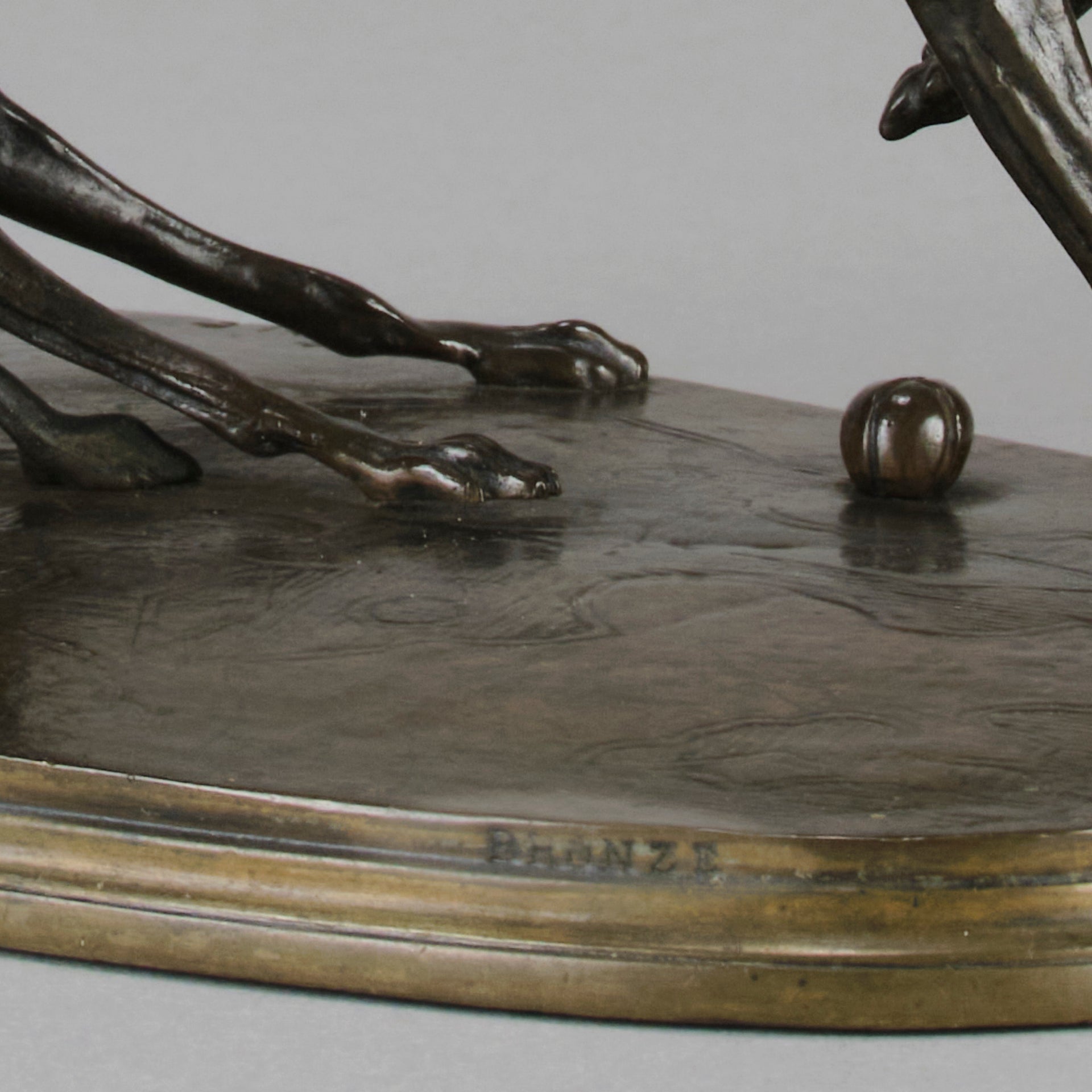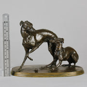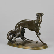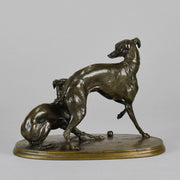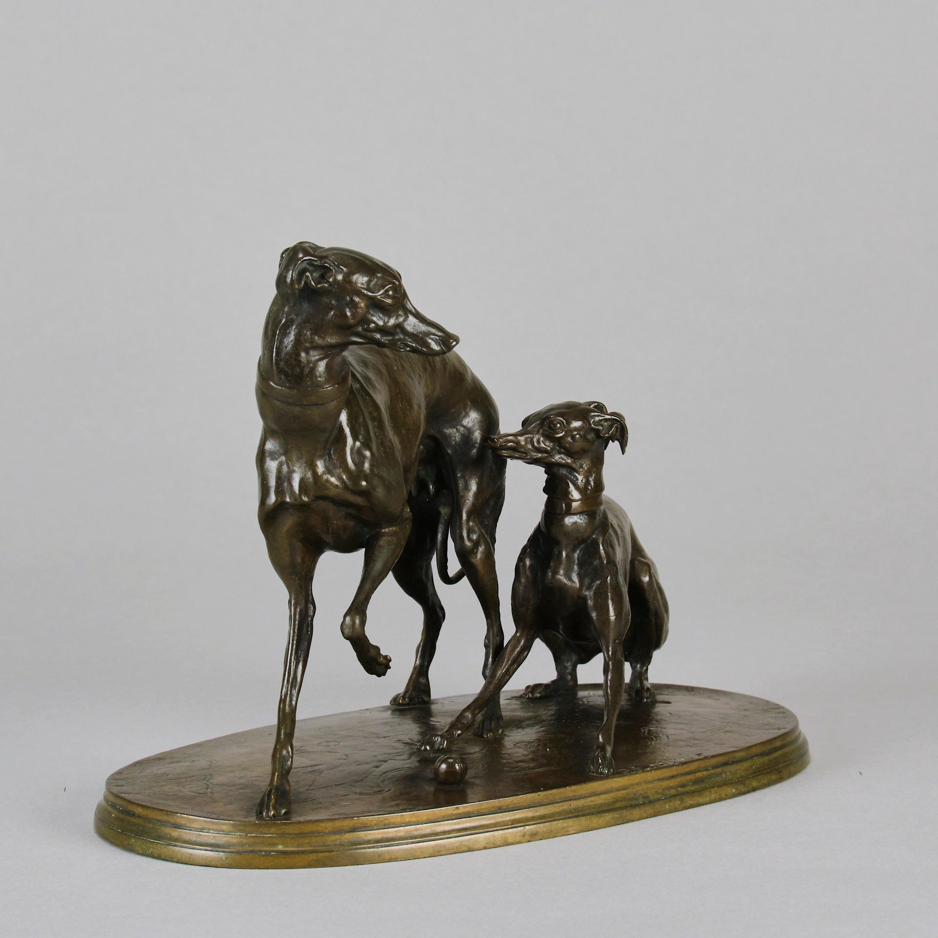 A delightful mid 19th Century French Animalier bronze study of two whippets playing with a ball on a naturalistic base representing a rug in an interior. The surface of the bronze with rich brown patination and fine detailed surface, signed P J MENE and stamped Coalbrookdale and BRONZE