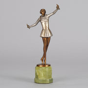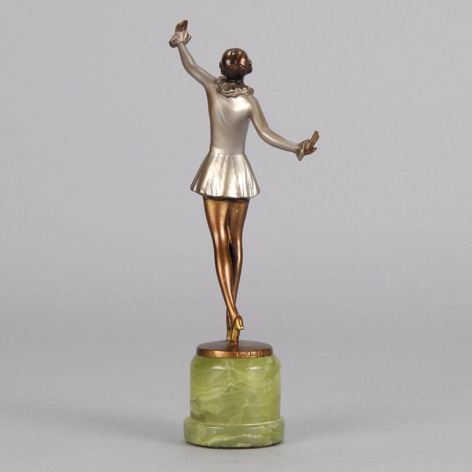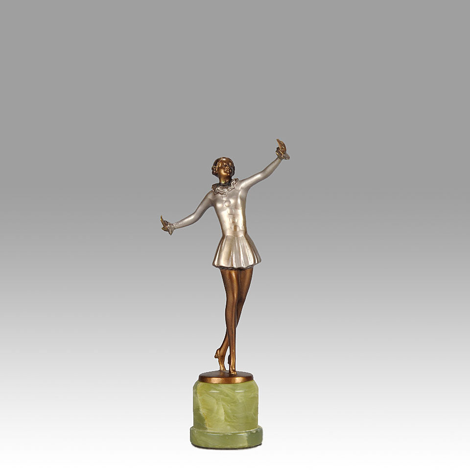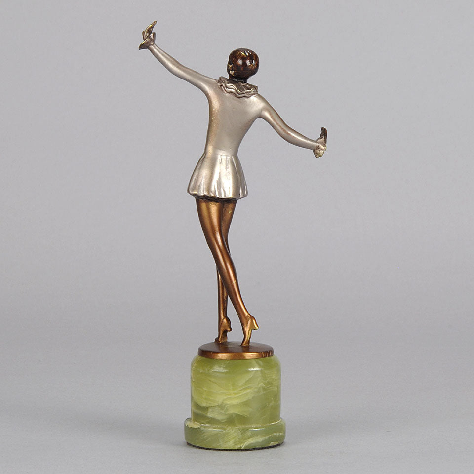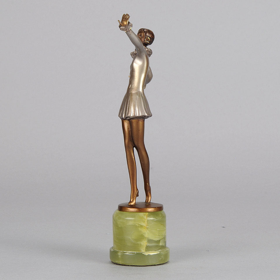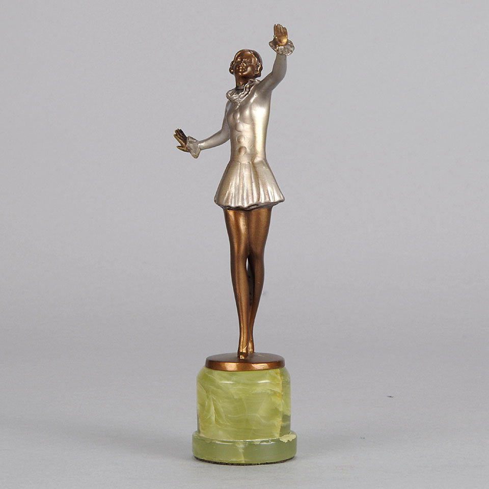 Very fine cold painted silver and enamel Art Deco Lorenzl bronze figure of a dancer in full costume with arms held high in animated dancing pose. The bronze has good colour and detail and is raised on green onyx base, signed to side on bronze base Lorenzl .