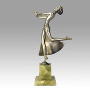 Wonderful energetic cold painted silver and enamel Art Deco Lorenzl bronze figure representing a dancer in full costume with arms in front of her and left leg kicked back in animated dancing pose. The bronze has excellent colour and good detail and is raised on rectangular stepped Brazilian green onyx base, signed to side on bronze base Lorenzl in engraved script.
