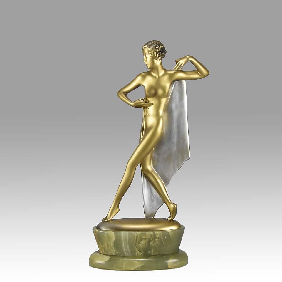 The Shawl is an enticing cold painted bronze figure of a nude Art Deco dancer in an elegant pose, holding a shawl behind her, with excellent deep gold and silver colour and very fine detail, raised on a Brazilian green onyx plinth and signed Lorenzl.
