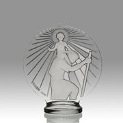 An eye catching early 20th Century French clear glass car mascot in roundel form. The surface deeply etched with St. Christopher, patron Saint of travel, carrying the boy Jesus on his shoulders, the surface with very fine hand finished detail, signed R.Lalique, France.