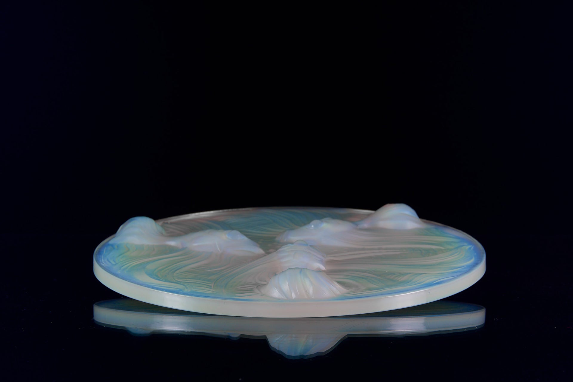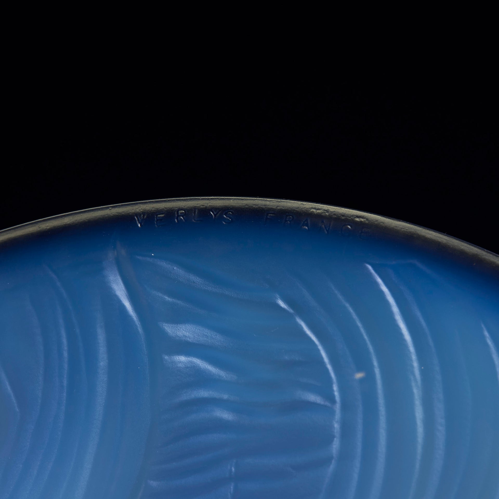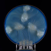 An impressive early 20th Century opalescent glass flat plate or dessert stand modelled with raised figures of swimming Koi fish with excellent hand finished surface detail and very fine deep blue opalescent colour, signed to the edge Verlys France